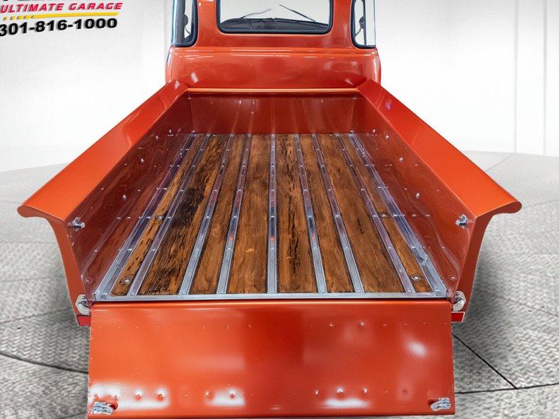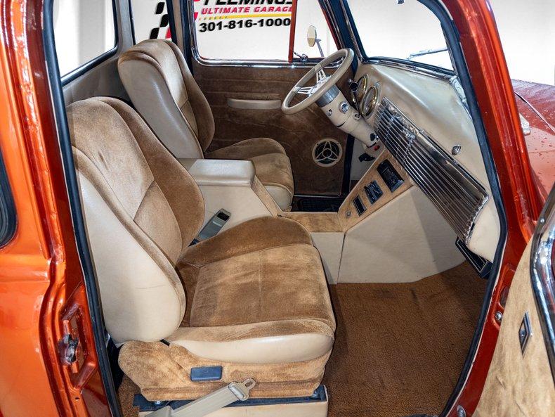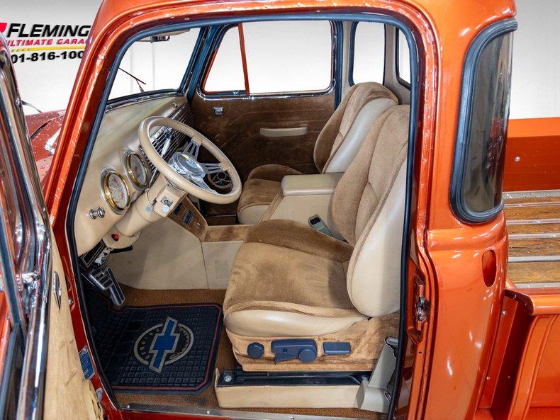 53 CHEVROLET 3100 CUSTOM RESTO-MOD PICKUP WITH CUSTOM TRAILER • No expense spared beautifully restored resto-mod (look under this truck!) • Upgraded rebuilt 400 cu-in V-8 with w/Weiand intake valve covers and a weber 4 bbl carburetor @350hp • Upgraded aluminum radiator and electric fan • Freshly built HD GM Overdrive automatic transmission • Show quality mirror finished custom Sunfire Orange metallic paint professionally show waxed and detailed. • Custom matching painted and beautifully restored trailer that can be used for business shows or a long trip • Custom tan bucket seat interior with matching door panels and console • Restored and upgraded dash with custom Tr-tech vintage style gauges including 140 MPH speedo gas volt and oil • Upgraded power windows • Customized frame w/ Camaro independent front end and 3" dropped suspension • Custom wood and stainless truck bed with rolled rear valance panel • Great looking Boyds 5 spoke Billet 18" & 20" staggered wheels with hi speed radials • Custom shaved doors with electric door poppers • Upgraded cross drilled power disc brakes • Upgraded Vintage Air brand modern Air- Conditioning and Heating • Great sounding custom flow master stainless exhaust • New polished stainless and rechromed front and rear bumpers • Upgraded tilt column w/ 4 spoke billet leather wrapped steering wheel Beautiful body show truck that was built for long drives. Show or drive this Collector quality custom 53 Chevy 3100 resto-mod that will turn heads