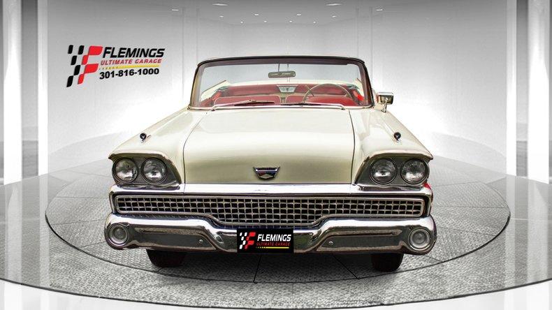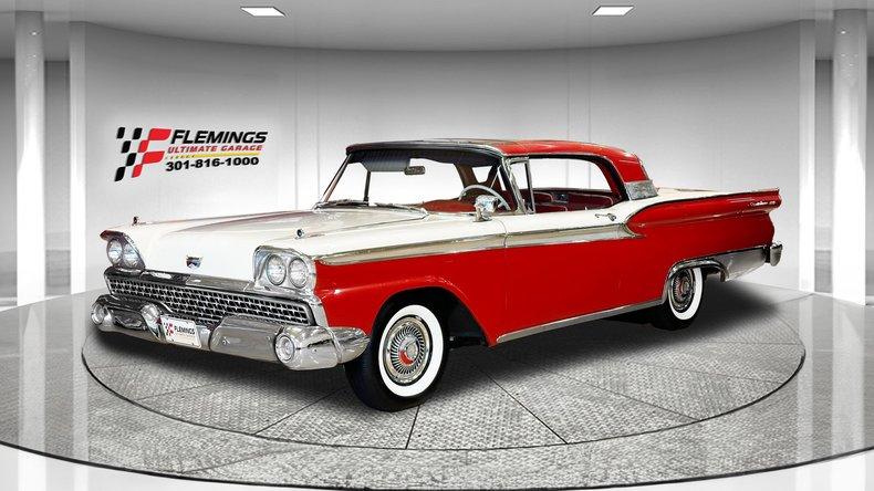 '59 FORD FAIRLANE 500 SKYLINER RETRACTABLE HARDTOP CONVERTIBLE • Stunning restoration well maintained and always garaged (Look Underneath this car!) • Long term ownership history • Rebuilt Original Ford Numbers Matching Interceptor Special 352 cid V8 @ 300hp • Rebuilt Optional 3 speed Ford Cruise-o-matic automatic Transmission • Correct Coded "E" Colonial White w/Torch Red Paint Professionally Show Waxed and Detailed • Restored correct tri-tone Red Whiteand dark twill insert split bench seat interior w/new carpets and door panels • Exceptionally Straight Body With Great Lines And Body Panel Fit And Finish • Iconic retractable power hardtop convertible in matching colors W/Skyliner callouts and luggage storage • Fully Restored Factory Dash w/ 120mph Speedo fuel and temp gauges • Restored Three Spoke Factory White Red and Chrome Steering Wheel • Great Sounding rear Exit Dual Exhaust W/ Chrome Tips • Optional Power Brakes • Original Ford AM Radio • Correct Sunburst wheel covers with white sidewall Radial Tires • Great looking Chrome And Polished Stainless Trim • Fully Detailed Engine Compartment • Fully Detailed Trunk w/Correct Matt Show or Drive this stunning 59 Fairlane 500 Skyliner iconic numbers matching retractable hardtop convertible!