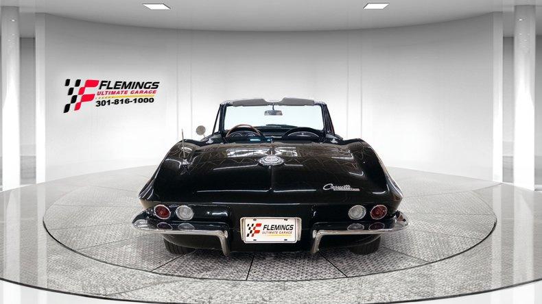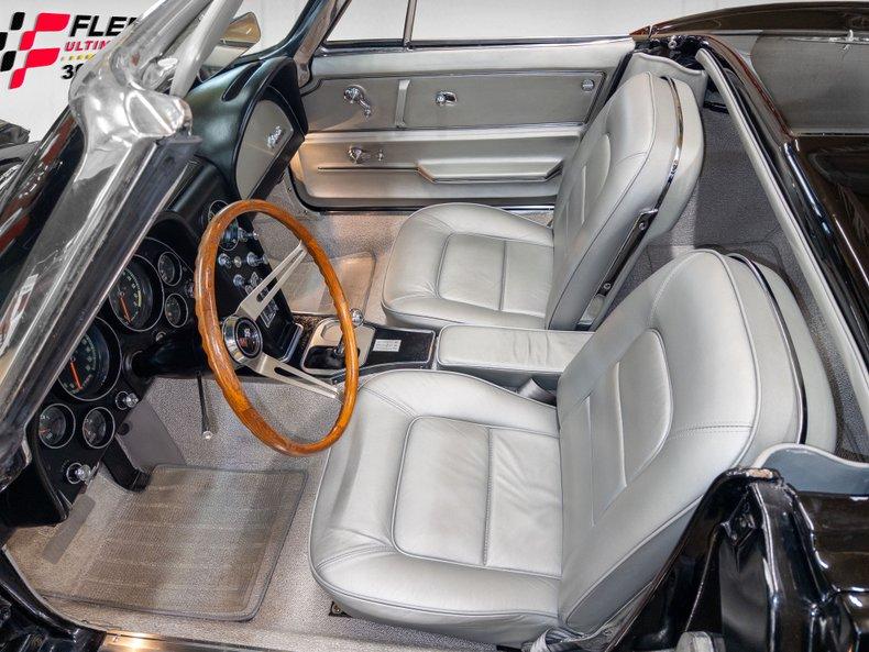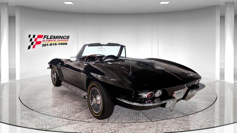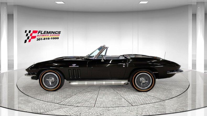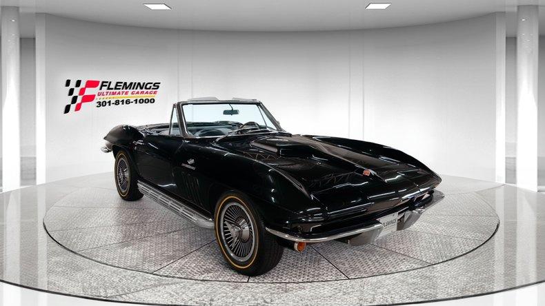 '65 CORVETTE FUELIE CONVERTIBLE MATCHING #'S STUNNING COLOR COMBO •This is the way we would want to own a collector car as it comes with the matching #'s drivetrain detailed on a stand and a hi perf 435hp small block 5 speed air-conditioning etc to make it a beautiful driving classic! • Professional Restoration built to show or just drive • Last year for the mid-year Fuelies and 1 of only 771 Fuel Injection Corvettes produced ( 23564 built in '65) how many are left? • Super Rare L84 "HG" coded matching #'s 327cid V8 with factory Rochester Fuel Injection @ 375hp (block casting #3782870) (Fuel Injection #7077375) • Matching #'s Muncie M20 4 speed manual transmission with Factory Shifter (P0120) • Matching #'s Fully independent rear differential • Mirror finish Tuxedo black paint show waxed and detailed • Optional color matched removable hard top (#C07) • Correct new black convertible top • Correct new silver leather bucket seat interior with factory console New seat covers Door Panels Carpets and Headliner • Fully restored dash w/full factory gauges including 7K RPM Tach & 160MPH Speedo • Optional teakwood factory Corvette 3-Spoke Steering Wheel ((N32) • Optional Factory AC Delco AM/FM • Restored chrome & polished stainless trim • Show Ready Detailed Engine Compartment with Correct GM Hoses and Tower Clamps • Optional Power 4 wheel disc Brakes and power steering • Correct knock-off Wheels (P48) with gold line tires tool kit and lead hammer • Optional (#759) Great sounding Factory side pipe dual exhaust • Comes with 2 painted hoods one factory hood and one big block hood • Upgraded Edelbrock 435hp crate engine w/ aluminum heads • Upgraded Tremec TKO 500 5 speed close ratio transmission for highway driving • Upgraded Vintage air brand modern air-conditioning and heat • Loaded with 3" binder of receipts $1000's+$1000's of restoration receipts books manuals 2 sets of keys its that kind of car • Show or just enjoy driving this Collector Quality Blue Chip Investment Grade 65 Corvette Fuelie roadster with 2 complete drivetrains to show or just drive.