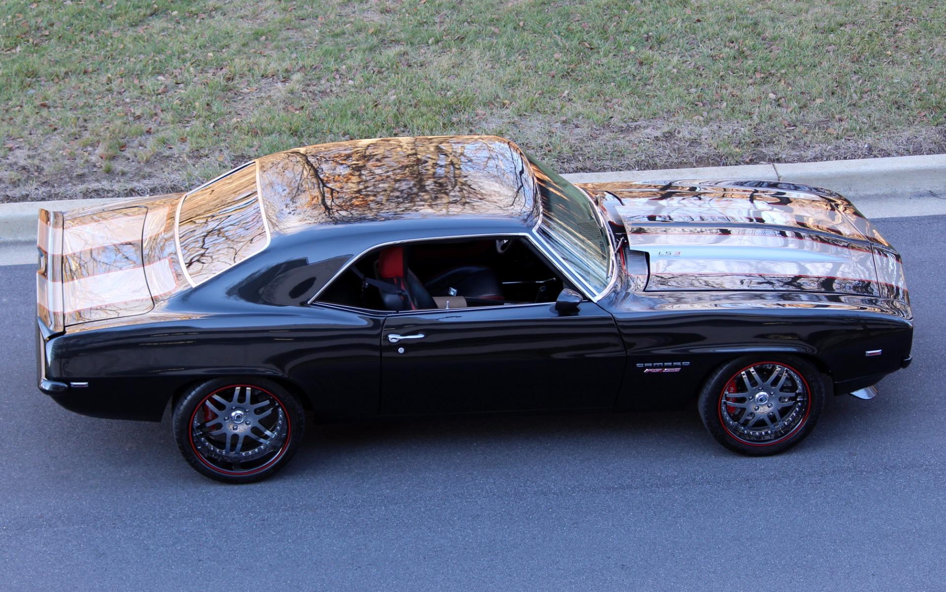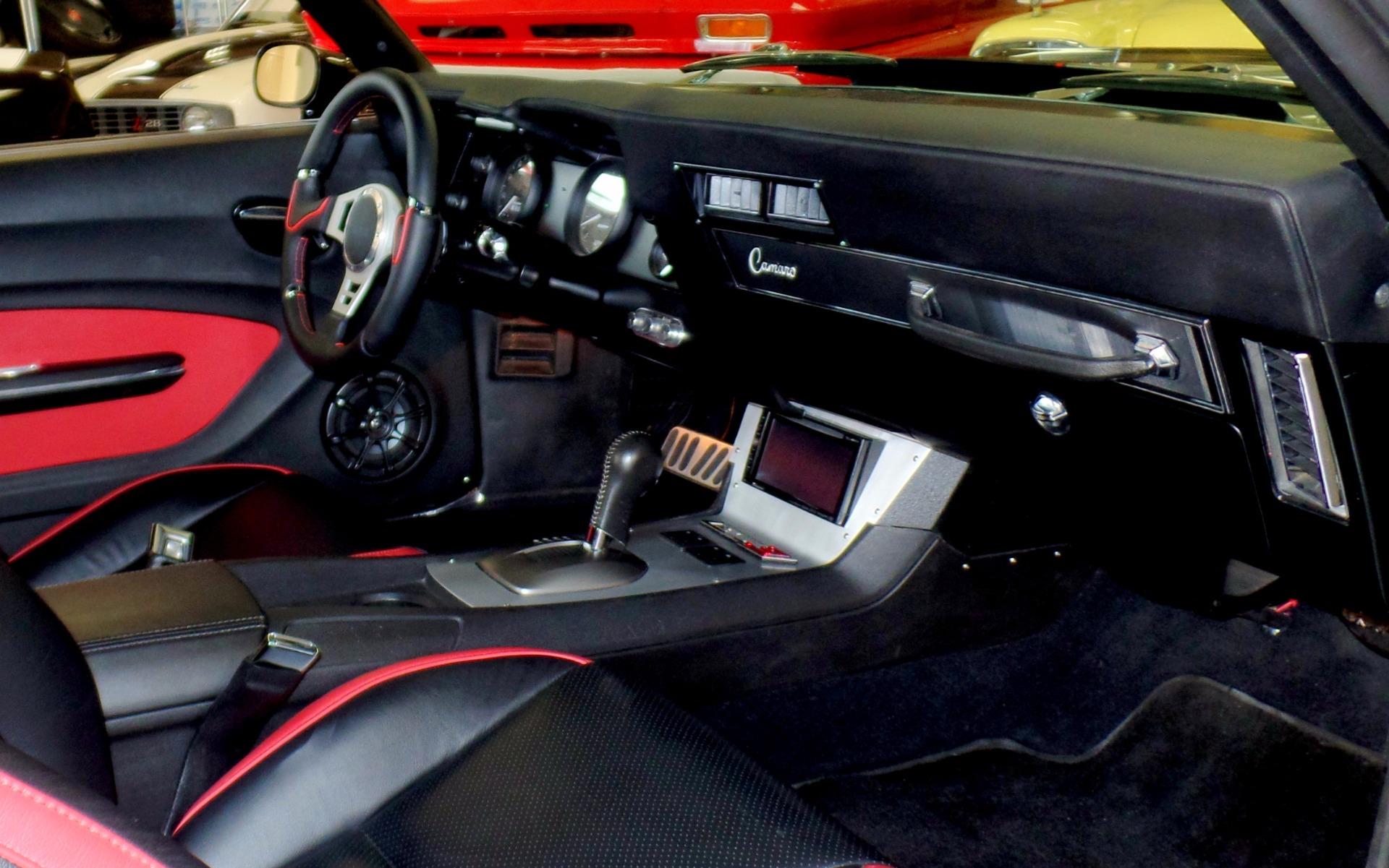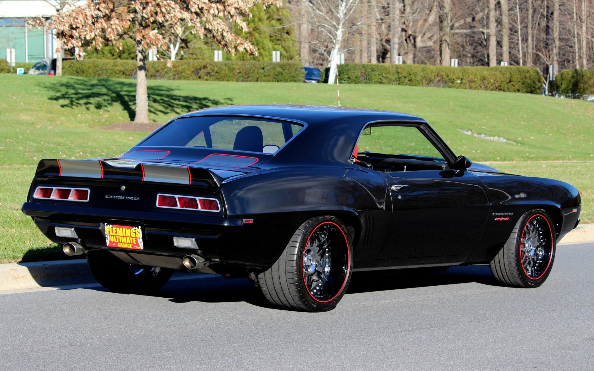 Fresh build by Flemings as the next generation of restomod, thinking in terms of the modern supercar....but with style ! Completely disassembled no expense spared dream car. Started with a great '69 Camaro body, smoothed and shaved firewall, all new panels including show painted underside, mirror finish Chevrolet carbon flash black metallic paint w/ 6 coats of clear, titanium silver stripes w/red pinstripes, custom front and rear spoilers, black custom leather power '11 Camaro bucket seats with red inserts and stitching, matching custom leather door panels, custom '11 Camaro console w/factory auto/manual shifter functionality, black suede custom headliner, Fessler custom package tray, DSE dash with Autometer Phantom carbon series gauges, power windows, tinted glass, power locks, Dynamat extreme noise reduction lined interior, DSE electric RS headlight door openers, Vintage brand polished front runner serpentine belt system, Vintage brand modern style air-conditioning+heat, LS3 aluminum block and heads power w/ upgraded camshaft-carbon intake manifold-custom remap @ 550hp, beautiful custom color matched engine covers, great sounding BBK stainless headers-Pypes custom bent polished stainless dual exhaust, GM HP6-speed close ratio automatic transmission, mini tub rear end, polished stainless fuel tank, Moser Ford 9 posi rear w/ 4.11 Detroit locker setup, Wilwood 14&13 cross drilled-slotted 4-wheel disc brakes w/ red calipers, Chrome master cylinder and HD brake booster, polished stainless tubular control arms, Alston chassis works powder coated subframe with fast ratio rack and pinion steering, 4 link fully adjustable coil over rear suspension for ride and height, Fessler Billet hood hinges-trunk hinges-door handles-fender braces-door handles, Fessler Billet LED rear taillights-backup lights-driving lights w/halos, narrowed+tucked front-rear bumpers, Pioneer Avic AM/FM/CD/SAT/Navigation w/ HI-FI digital sound, Custom shoulder style seat belts for 5, modern Camaro RS/SS badging, Asanti custom built 18X9 and 19X12 3 piece alloys with hi speed Michelin pilot sports, We've never built a nicer car, somewhere around 2000 hours ! Show, cannonball run, vintage race, stops traffic wherever it goes, spectacular !