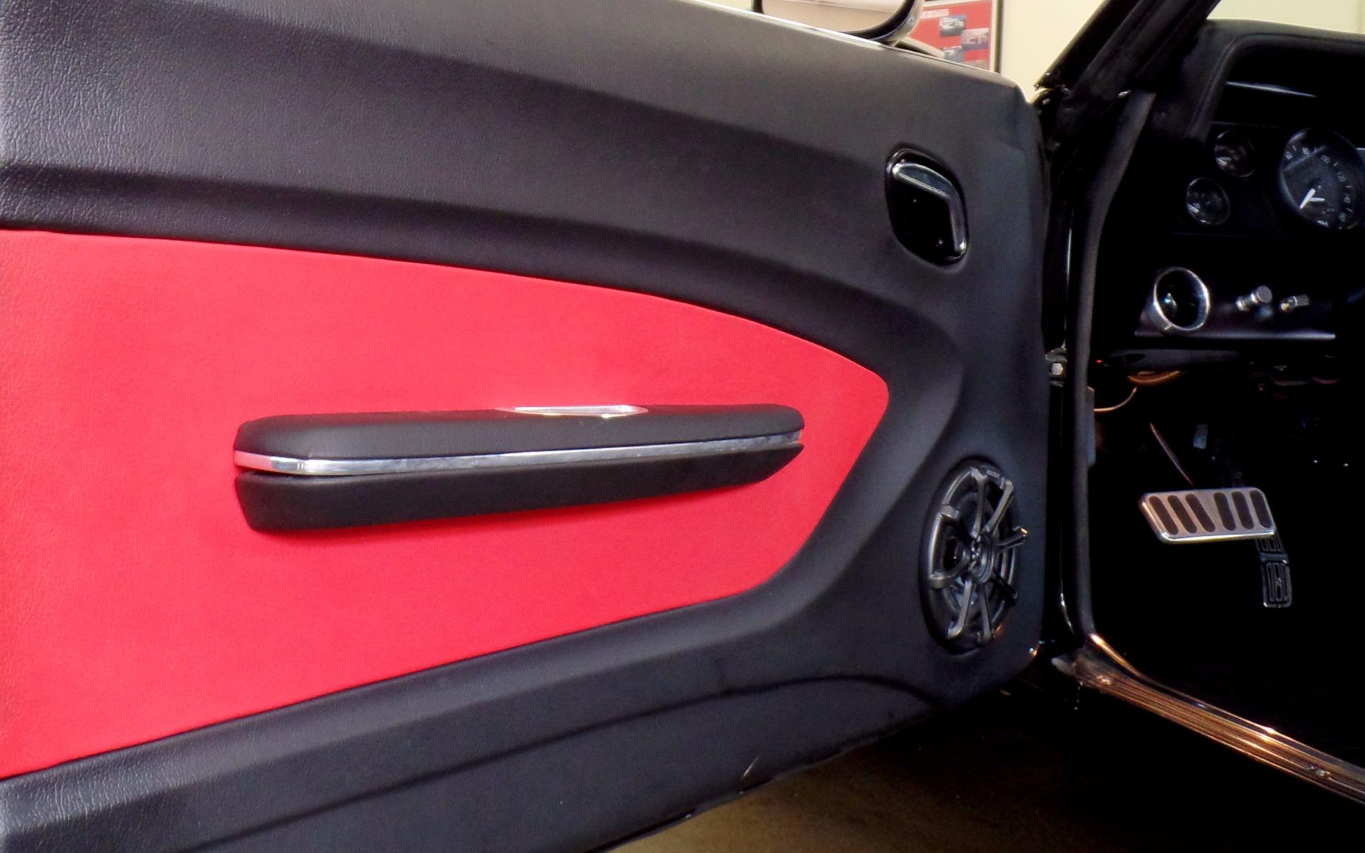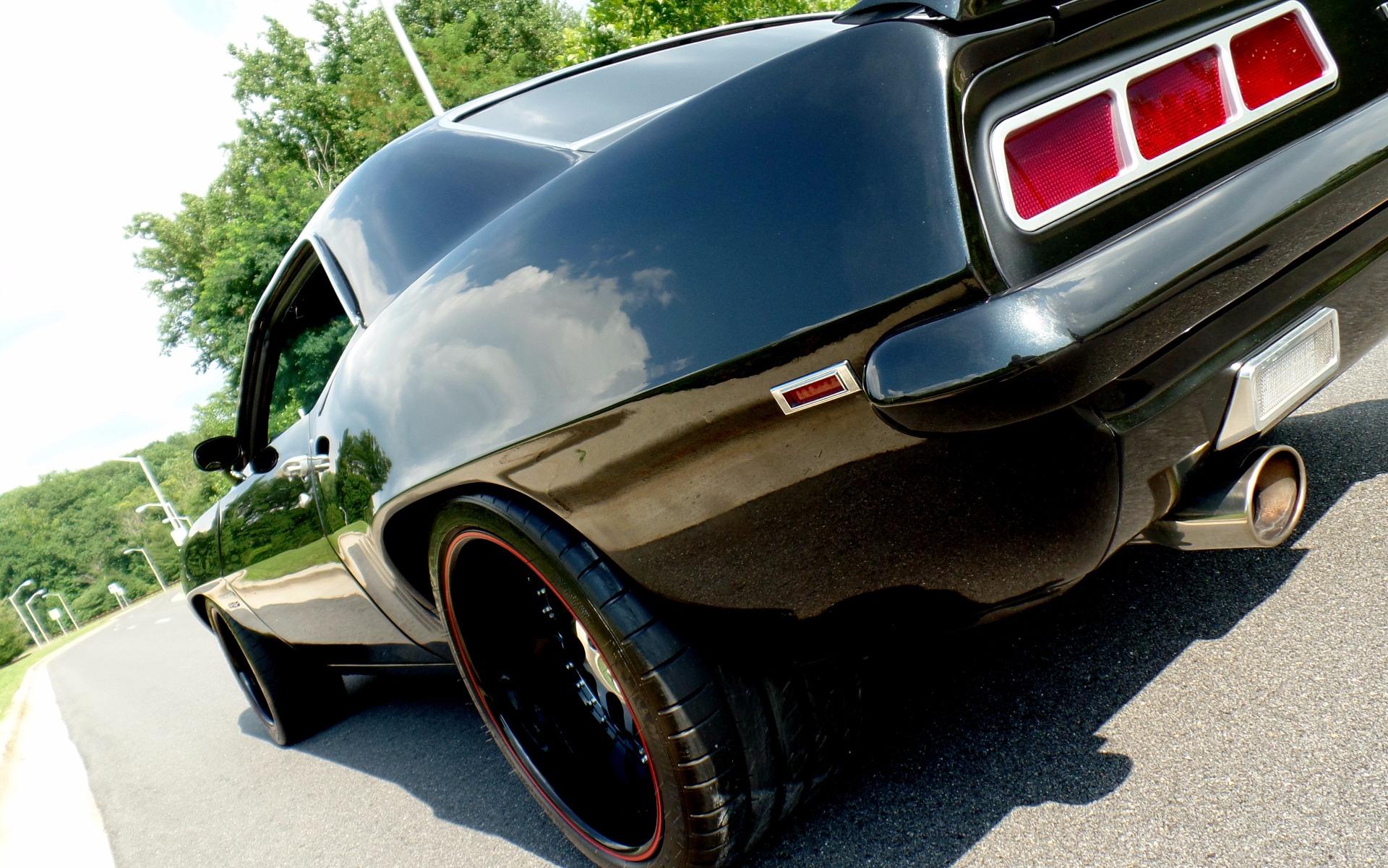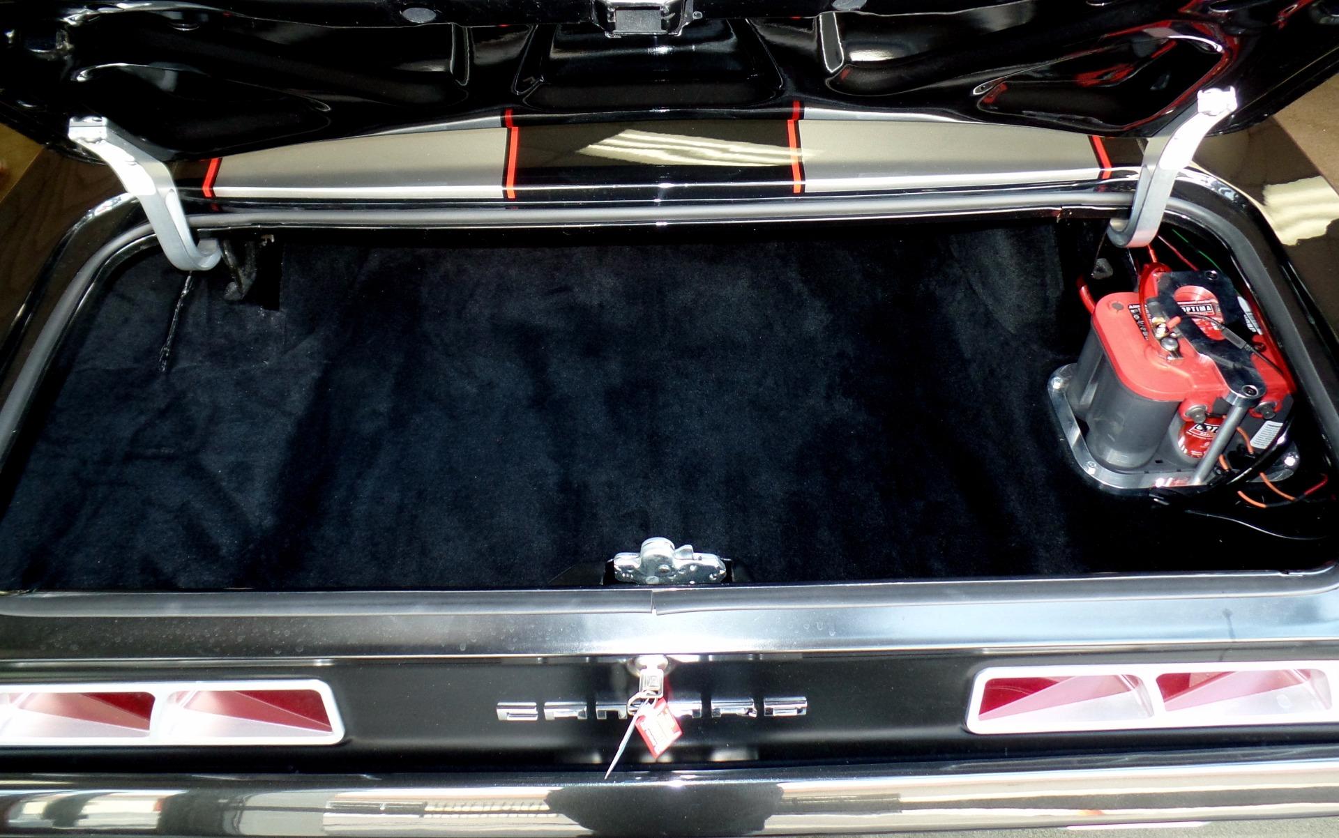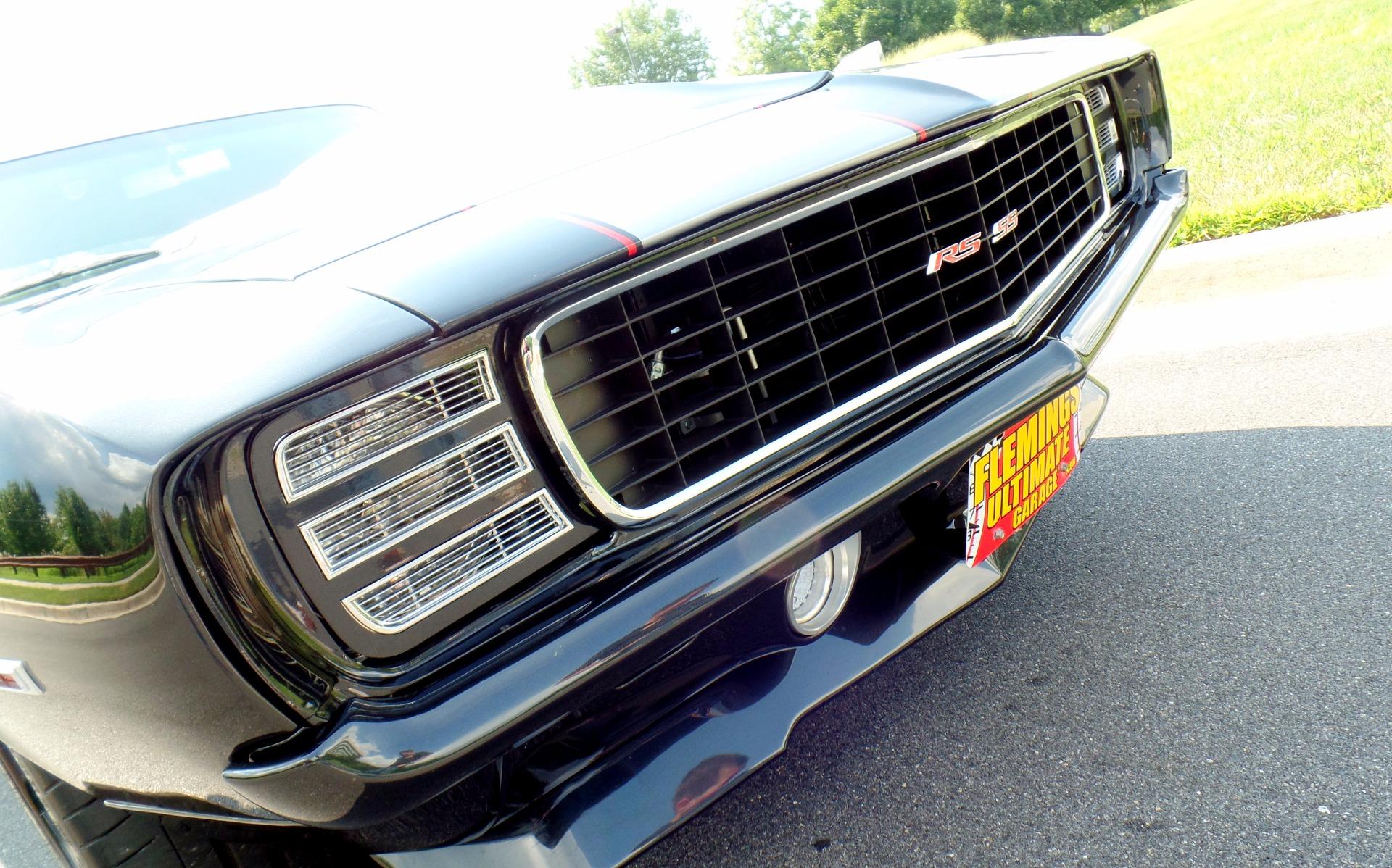 Fresh build by Flemings as the next generation of restomod, thinking in terms of the modern supercar....but with style ! Completely disassembled no expense spared dream car. Started with a great '69 Camaro body, smoothed and shaved firewall, all new panels including show painted underside, mirror finish Chevrolet carbon flash black metallic paint w/ 6 coats of clear, titanium silver stripes w/red pinstripes, custom front and rear spoilers, black custom leather power '11 Camaro bucket seats with red inserts and stitching, matching custom leather door panels, custom '11 Camaro console w/factory auto/manual shifter functionality, black suede custom headliner, Fessler custom package tray, DSE dash with Autometer Phantom carbon series gauges, power windows, tinted glass, power locks, Dynamat extreme noise reduction lined interior, DSE electric RS headlight door openers, Vintage brand polished front runner serpentine belt system, Vintage brand modern style air-conditioning+heat, LS3 aluminum block and heads power w/ upgraded camshaft-carbon intake manifold-custom remap @ 550hp, beautiful custom color matched engine covers, great sounding BBK stainless headers-Pypes custom bent polished stainless dual exhaust, GM HP6-speed close ratio automatic transmission, mini tub rear end, polished stainless fuel tank, Moser Ford 9 posi rear w/ 4.11 Detroit locker setup, Wilwood 14&13 cross drilled-slotted 4-wheel disc brakes w/ red calipers, Chrome master cylinder and HD brake booster, polished stainless tubular control arms, Alston chassis works powder coated subframe with fast ratio rack and pinion steering, 4 link fully adjustable coil over rear suspension for ride and height, Fessler Billet hood hinges-trunk hinges-door handles-fender braces-door handles, Fessler Billet LED rear taillights-backup lights-driving lights w/halos, narrowed+tucked front-rear bumpers, Pioneer Avic AM/FM/CD/SAT/Navigation w/ HI-FI digital sound, Custom shoulder style seat belts for 5, modern Camaro RS/SS badging, Asanti custom built 18X9 and 19X12 3 piece alloys with hi speed Michelin pilot sports, We've never built a nicer car, somewhere around 2000 hours ! Show, cannonball run, vintage race, stops traffic wherever it goes, spectacular !