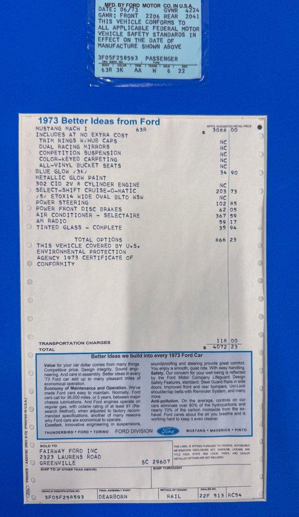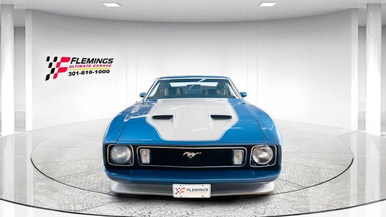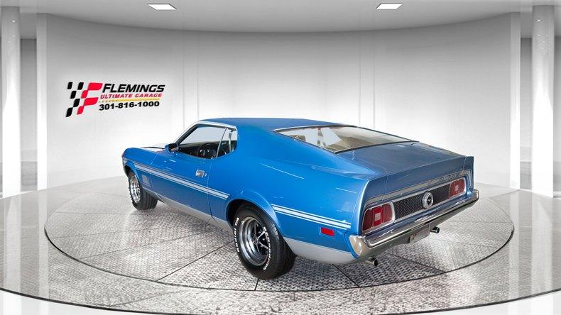 '73 MUSTANG MACH 1 LOADED WITH OPTIONS!!! • Last year produced collector car professional restoration of this iconic muscle car • Optional Rebuilt 302 cid V8 • Rebuilt Optional Cruise-o-matic automatic Transmission • Rebuilt original factory 3.oo Rear Differential • Mirror finish Blue Glow Metallic paint w/ silver Mach 1 stripes + callouts professionally show waxed and detailed • Iconic functional Ram air Hood with correct fresh air air cleaner (expensive setup) • Optional front spoilers • Optional Dual racing mirrors • All new Black High-Back Bucket seat interior with optional console • Full factory gauges including 120MPH speedo oil etc • Correct Mach 1 Steering Wheel • OptionalFactory Ice Cold Air Conditioning A/C • Upgraded Classic look digital AM/FM/AUX Stereo and Premium Speakers • Great looking Chrome and Stainless Trim • Great looking Door Panels Carpets and Headliner • Show Ready Detailed Engine Compartment • Detailed Trunk with Spare and Correct Mat • Optional Power disc Brakes • Optional fast ratio power steering • Optional Magnum 500's wheels with BFG Radial T/A's • Great sounding dual exhaust • Deluxe Marti report showing 1 of only 349 in this color combination (134867 Mustangs built that year!) • Show or Drive this collector quality great color combination iconic '73 Mach 1