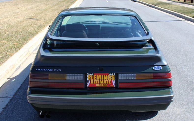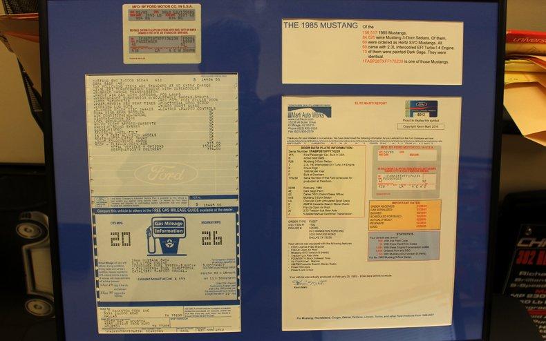 "1985 Ford Mustang (Fox Body) • 1 of 60 Mustang SVO's Purchased by Hertz • 1 of only 10 Dark Sage Green Mustang Produced in 1985 • 1 of only 4 Dark Sage Rent-A-Racer's still in existence • Unbelievable all original time capsule and only 67648 original miles (driven 2000 miles a year!!) • Rebuilt Ford EFI 2.3 Liter Turbocharged and intercooled lightweight factory 4 @ 175HP • Rebuilt Original 5-speed close-ratio manual transmission • Original HD Traction-LOK Rear differential • Mirror factory ""4E"" Dark Sage Green paint professionally show waxed & detailed • Functional Hood Scoop for Air-to-Air Intercooler • Great looking Graphite Grey bucket seat interior with full factory console and shifter • Full factory gauges including 8K RPM Tach • Factory wrap steering wheel w/ tilt column • Ice-cold factory Air-Conditioning A/C • Original AM/FM/Cassette Stereo from Dolby system • Loaded w/ options including power windows power locks power mirrors & leather-trimmed Hurst shifter • Rack + Pinion Power Steering & Power Disc Brakes • Original 16"" wheels w/ High-Speed Radials • Loaded with docs including Elite Marti Report and copy of the Original Window Sticker too! • Show or drive this ultra-Rare Hertz Mustang SVO"
